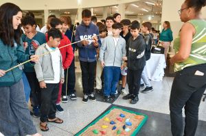 Um grupo de alunos adolescentes esteve participando de joguinhos na Sala Betha do campus 2; equipada com mesas interativas, realidade aumentada, holografia, peças impressas em 3D, celulares, tabletes e projetores de alta definição.