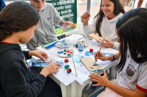 A aluna mestranda do Programa de Pós-graduação em Educação (PPGE), Aline Batista Rosa Rubini, proporcionou a oficina “Cores da floresta: pintando a sustentabilidade com madeira reutilizada”.