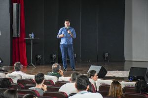 Durante a abertura, na tarde desta quarta-feira (22), no Teatro César Cava, o professor Décio destacou a relevância do tema no atual contexto das transformações tecnológicas.