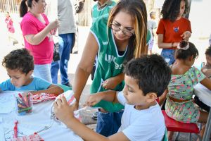 O curso de Odontologia ofereceu cuidados de saúde bucal, com orientação sobre escovação correta e distribuição de kit de higiene; em atuação junto com a Secretaria Municipal de Saúde.